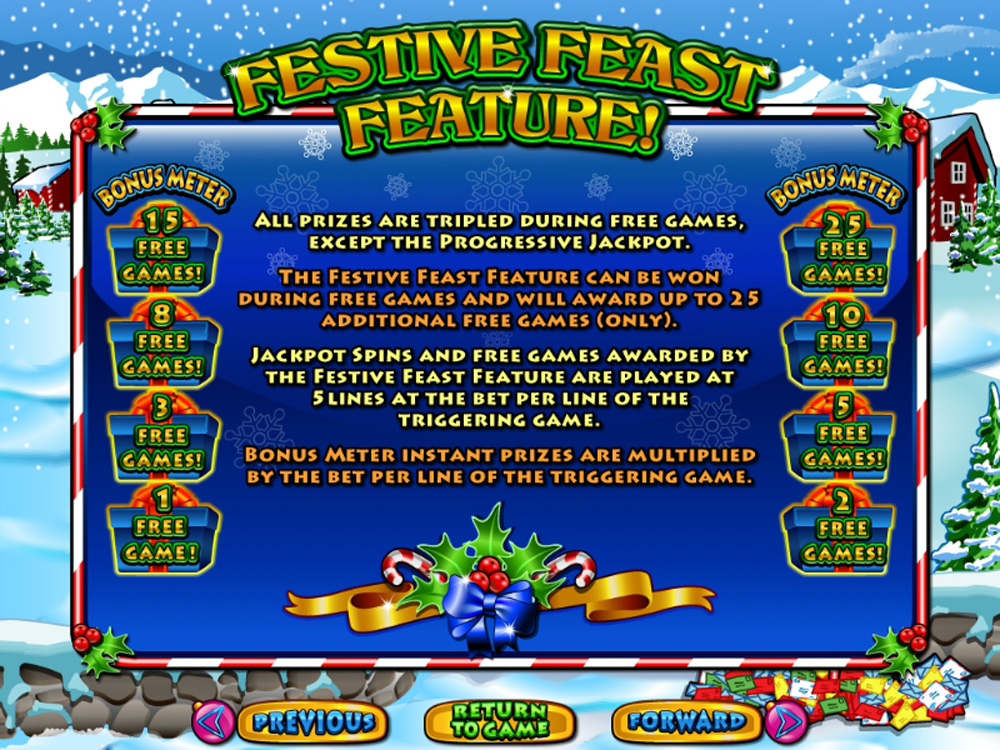 The Festive Feast Feature is triggered every time three symbols, other than the jackpot symbols, line up on an active payline. You are awarded one of the prizes on the bonus meters which are located on both sides of the reels. These prizes include: 2500x bet, jackpot spins, a single jackpot spin, 3, 10, or 25 free games, and no bonus. Unfortunately there are two of those “no bonus” prizes and it seems to land on one of them more often than not.