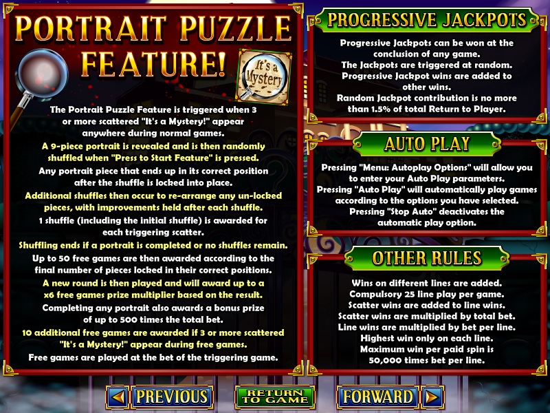 It’s a Mystery is a 5-reel slot found at RTG online casinos. This slot game features 25 paylines, wild symbols, and the Portrait Puzzle Feature.